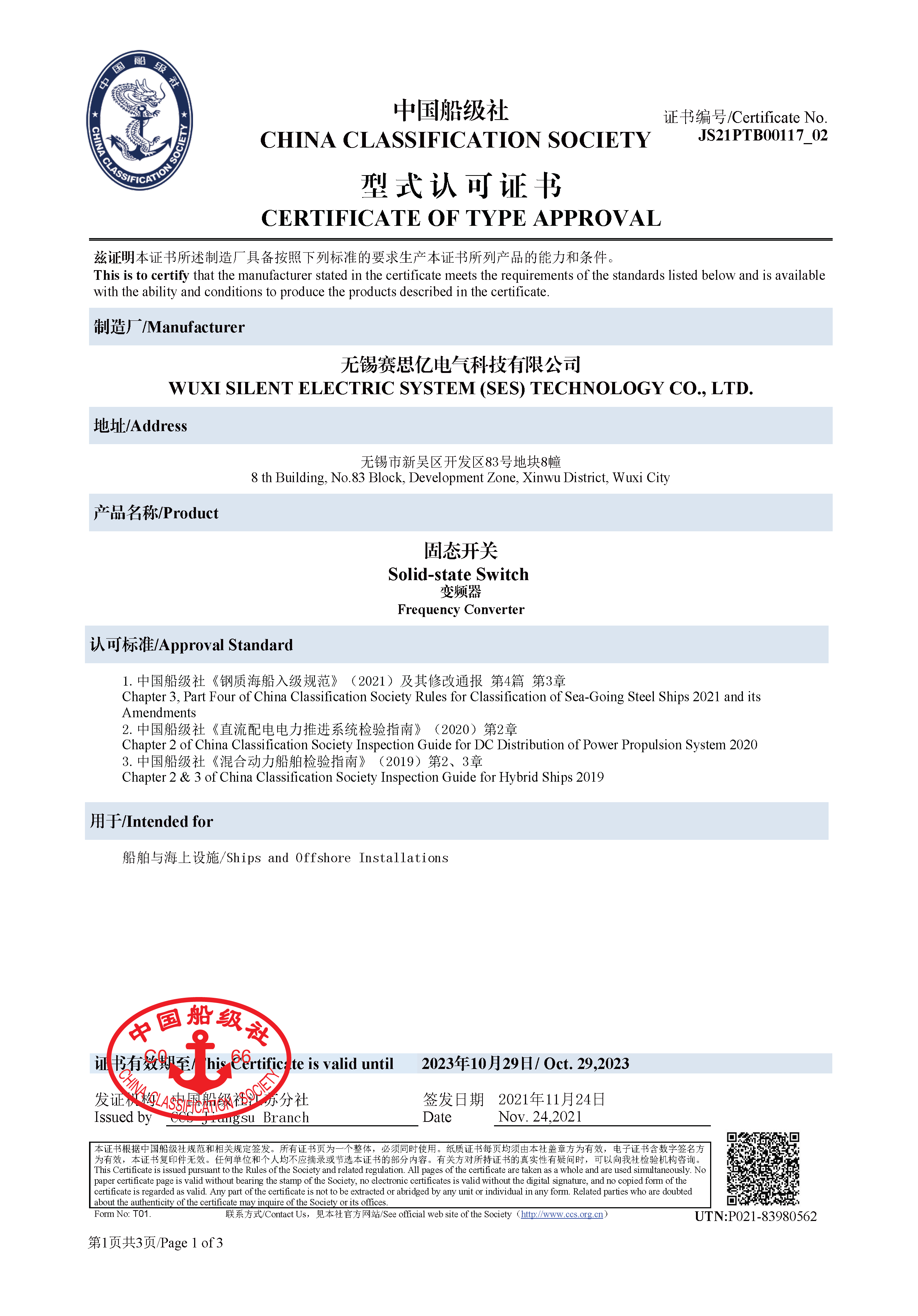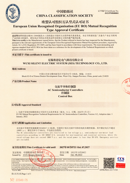交流半導體控制器歐盟認可組織互認型式認可證書(CCS)