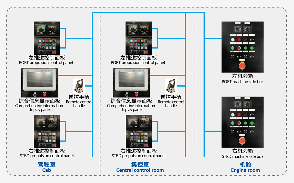 遙控系統(tǒng)由機(jī)旁控制、駕控控制、電池系統(tǒng)控制及綜合監(jiān)控系統(tǒng)組成,整套遙控系統(tǒng)和電力推進(jìn)系統(tǒng)基于PLC控制單元和現(xiàn)場總線網(wǎng)絡(luò)相結(jié)合,實現(xiàn)船員對于整船動力的人機(jī)交互和控制功能,可以通過不同站點實現(xiàn)對推進(jìn)電機(jī)的啟停、調(diào)速控制,以及各站點的操作切換,同時可以實時監(jiān)控船舶推進(jìn)系統(tǒng)各個設(shè)備的運行狀態(tài)、報警信息。