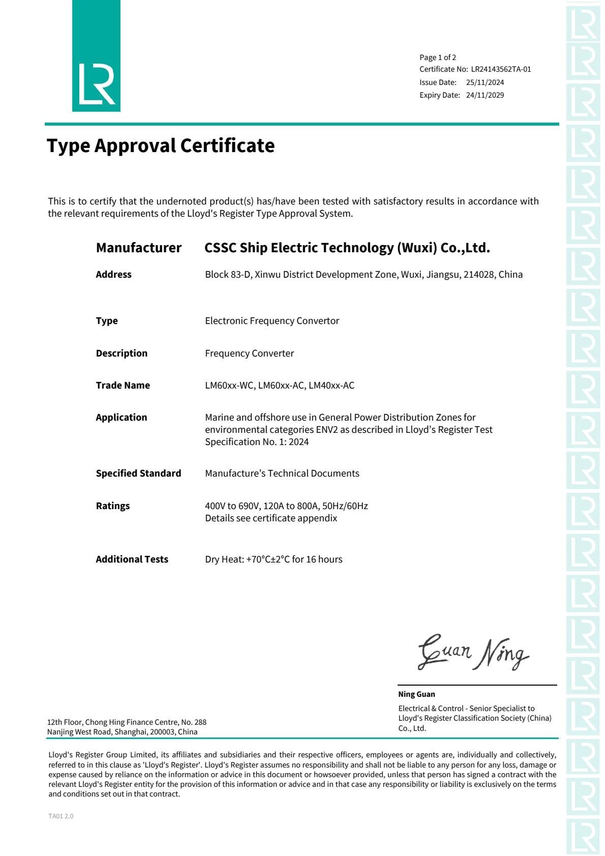 2024年11月25日,中船賽思億(無錫)電氣科技有限公司(CSSC Ship Electric Technology ( Wuxi) Co.,Ltd.)核心變頻電控設(shè)備順利取得英國勞氏船級(jí)社(LR)型式認(rèn)可證書,成為國內(nèi)為數(shù)不多的取得英國勞氏船級(jí)社(LR)型式認(rèn)可證書的船舶電力推進(jìn)企業(yè)。目前中船賽思億已取得CCS、BV、RINA、DNV、LR等五大國際主流船級(jí)社型式認(rèn)可證書,是目前國內(nèi)唯一一家擁有五大船級(jí)社型式認(rèn)可證書的國產(chǎn)船舶電力推進(jìn)企業(yè),對(duì)中船賽思億的海內(nèi)外市場(chǎng)開拓和國際化發(fā)展進(jìn)程,具有重要意義。