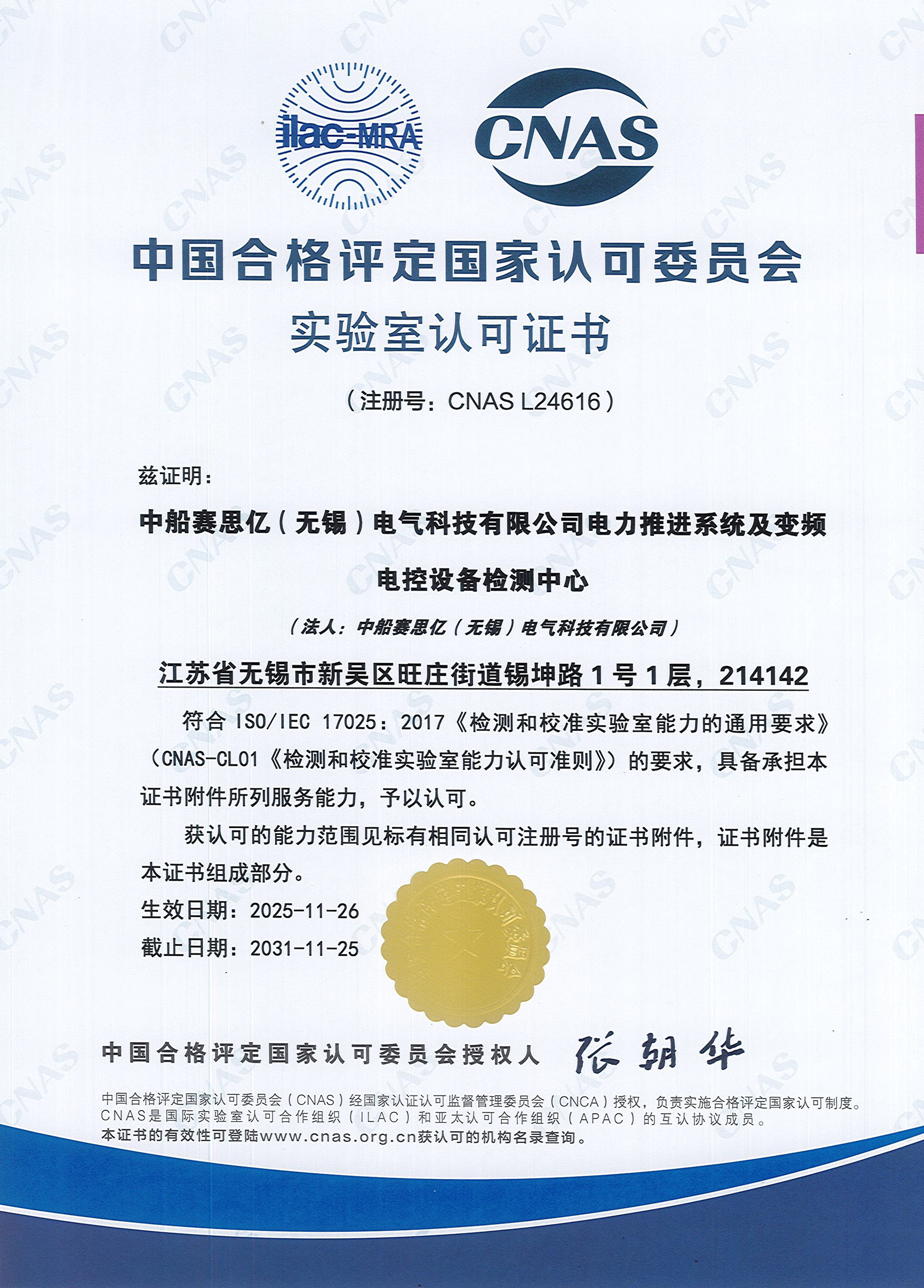 2025年11月26日,中船賽思億(無錫)電氣科技有限公司(CSSC Ship Electric Technology ( Wuxi) Co.,Ltd.)電力推進(jìn)系統(tǒng)及變頻電控設(shè)備檢測中心順利取得中國合格評定國家認(rèn)可委員會(CNAS)實(shí)驗室認(rèn)可證書(注冊號:CNAS L24616),此舉標(biāo)志著中船賽思億在電力推進(jìn)系統(tǒng)性能驗證、變頻電控設(shè)備可靠性測試等核心環(huán)節(jié)的檢測能力,以及全流程質(zhì)量管理體系已達(dá)到了國家 / 國際認(rèn)可的水平,該檢測中心出具的檢測數(shù)據(jù)、報告在國內(nèi)及互認(rèn)的國際范圍內(nèi)具備高權(quán)威性和公信力。