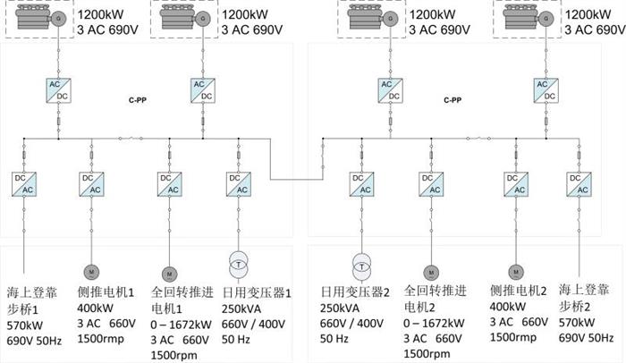 該項(xiàng)目由無錫賽思億電氣科技有限公司提供的全船直流組網(wǎng)變頻電控系統(tǒng)動(dòng)力總成,供貨范圍包括:直流組網(wǎng)變頻電控系統(tǒng)、柴油發(fā)電機(jī)組、舵槳系統(tǒng)、動(dòng)力定位系統(tǒng)(DP-2)、配電板及機(jī)艙檢測(cè)報(bào)警系統(tǒng)等設(shè)備,順利通過了首次海試任務(wù),完全符合船東的技術(shù)要求,滿足本船的使用條件,獲得了船東、船廠及設(shè)計(jì)院的高度的贊賞。直流組網(wǎng)技術(shù)在“雄程天威1”號(hào)上的應(yīng)用,不僅解決了雙體船機(jī)艙空間小的問題,還可充分滿足在風(fēng)場(chǎng)惡劣海況下對(duì)船舶動(dòng)力定位(DP-2)、登乘系統(tǒng)的高動(dòng)態(tài)響應(yīng)能力的技術(shù)要求,進(jìn)一步提升了船舶的動(dòng)態(tài)響應(yīng)特性。