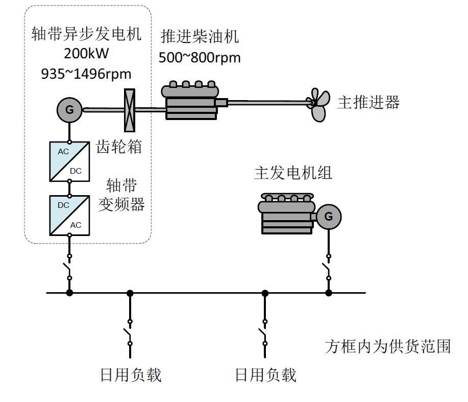 高欄01/02散貨船,采用S-Hybrid 主機(jī)+電力推進(jìn)混合動(dòng)力系統(tǒng),在不改變船舶原有主機(jī)動(dòng)力形式的前提下,充分利用船舶在遠(yuǎn)洋航線的經(jīng)濟(jì)航速工況,通過主機(jī)冗余功率帶動(dòng)異步電機(jī)發(fā)電運(yùn)行,在提高主機(jī)負(fù)荷率改善其油耗的同時(shí),可以關(guān)停船舶輔機(jī),節(jié)省了船舶的運(yùn)營油耗。